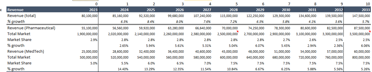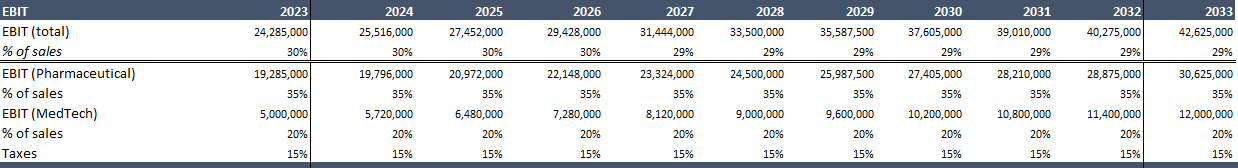 I also assume Johnson & Johnson will achieve an overall operating margin of 30%, with pharmaceuticals reaching a margin in the mid-30s and MedTech achieving a margin of 20%, in line with industry averages.