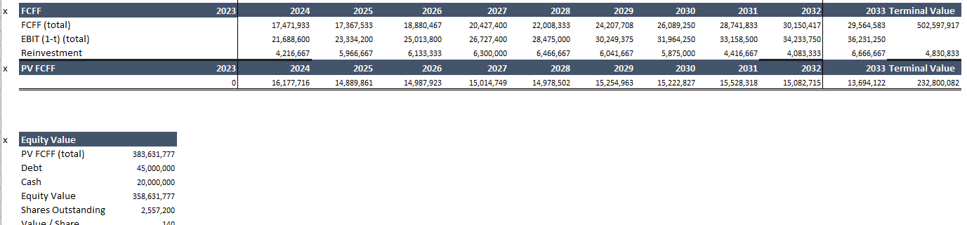 Ultimately, I derive Free Cash Flow by subtracting reinvestments from EBIAT (Earnings Before Interest after Taxes). The reinvestment projection for the upcoming years is calculated using a static Sales-to-Capital ratio of 1.2, which is slightly above the industry’s historical average and therefore reasonably optimistic in my opinion.