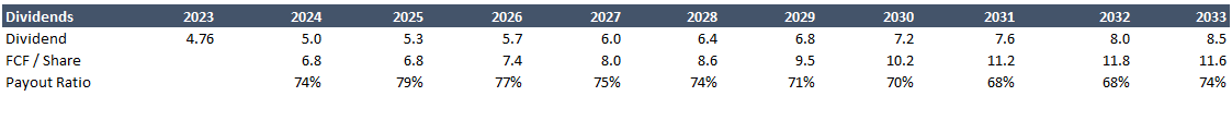 I have assumed an annual dividend growth rate of 6%, aligning with the average dividend growth over the past 3 years. With that, despite reasonable concern about the company’s transformation in terms of stability without a black swan event happening, the dividends should be fairly safe.