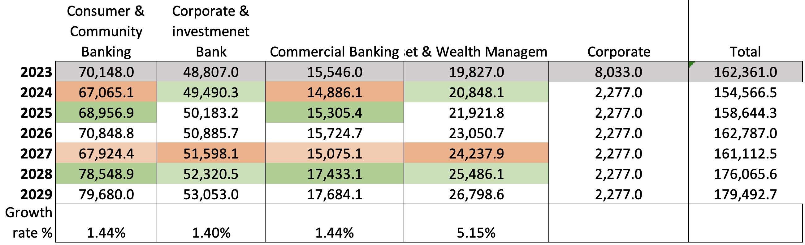 Then the next step is to calculate revenue. The first thing to do is to know how much those 125 yearly new branch openings will generate in revenue. This will mostly be for the consumer and commercial banking segments. When dividing the 2023 consumer (community banking revenue of $70.14B and the commercial banking revenue of $15.54B by the 4,700 branches that JPMorgan Chase has, I get each branch is generating approximately $14.92M and $3.30M in revenue respectively. Then each segment will grow at the growth rate of the respective market in which they operate.