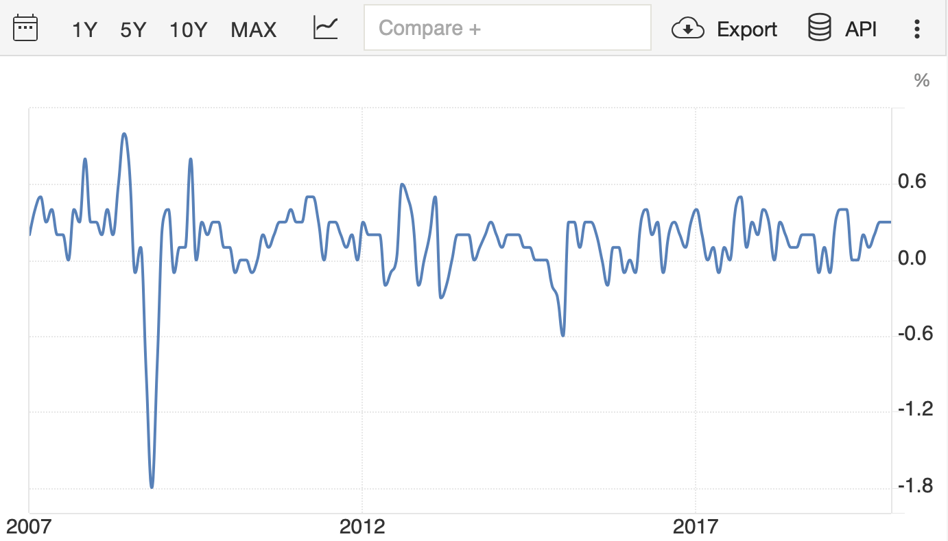 Monthly YoY CPI Change % 2007-2019 (Trading Economics)