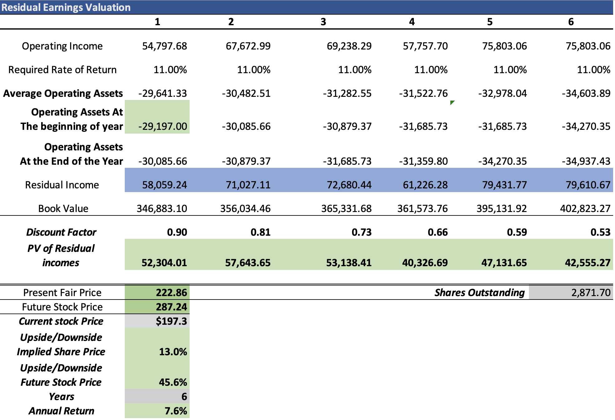 The last step is to calculate the future stock price for the year 2029. To do that, I will use the undiscounted residual earnings that are highlighted in blue in the model below. Then I will sum the estimated book value for year 6 of the projection. Later, I divide by the total amount of shares outstanding.