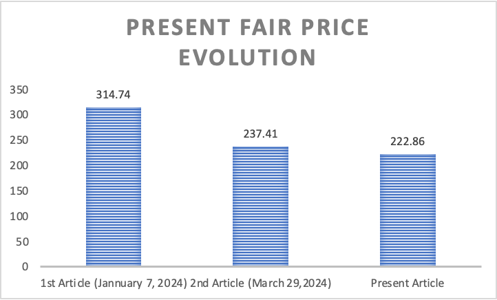 In my first article on JPMorgan, which was published on January 7, I assigned a present fair price to the stock of $314.74. In the second article, I assigned a fair price of $237.41, and in the present article, I readjusted my estimate to $222.86. From my second to my current article, my fair price estimate has gone down by 6.12%, mainly due to changes in JPMorgan’s financial condition, however, my model still indicates a possible upside.