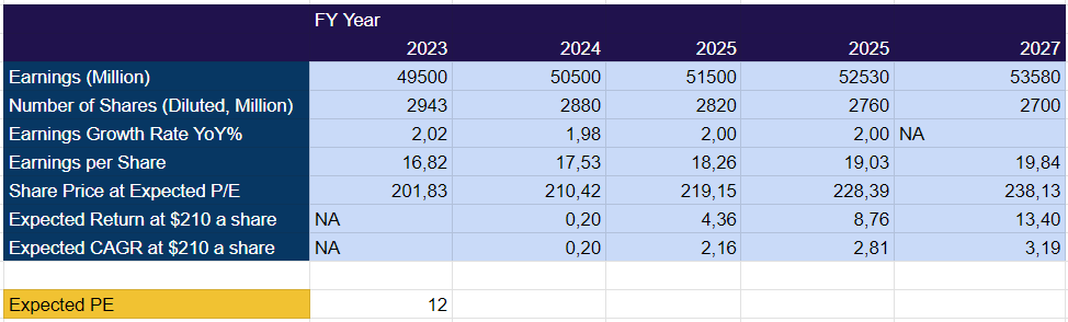 As mentioned by the CFO in the earnings call, the bank industry might begin to enter a stabilization/normalization period as lower interest rates emerge. Mr Barnum has also expressed that the revenues should go higher organically in line with GDP growth, or even slightly higher. Taking this into consideration, I provide a financial model with a slow but normalized 2% revenue growth, assuming there is not an economic collapse. The framework offers an eventual price projection for the year 2027, a total expected capital appreciation return, and a CAGR with the share price beginning at $210.