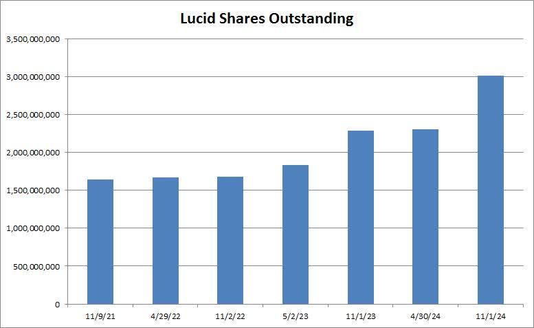 With these massive losses continuing, Lucid’s cash burn has really piled up. $622 million was burned in Q3 alone, but that was a roughly $84 million improvement over last year’s period. However, the company has burned over $2 billion already in the first nine months of this year, which resulted in another major capital raise that has recently sent the share count soaring.