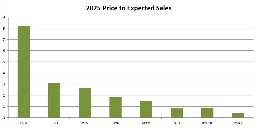 If you average the 7 names other than Lucid, the result is about 2.31 times expected 2025 revenue. Lucid finished Thursday going for about 3.12 times, a significant premium to this comparison group. If we were to exclude Tesla, however, that average drops to just 1.33 times, and these numbers don’t include traditional US automakers like Ford (F) or General Motors (GM) that trade at around 0.30 times their expected revenues for next year.