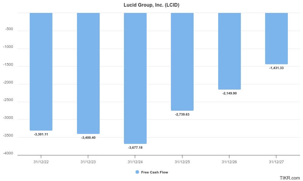 As seen above, Lucid is still expected to post negative free cash flow through the 2027 forecast period. With a projected cash outflow of almost $10B through FY2027, Lucid’s current $5B liquidity isn’t enough to sustain its cash flow requirements.