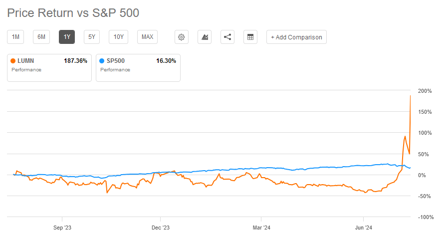 Above: LUMN stock outperformed the S&P 500 in the last year.