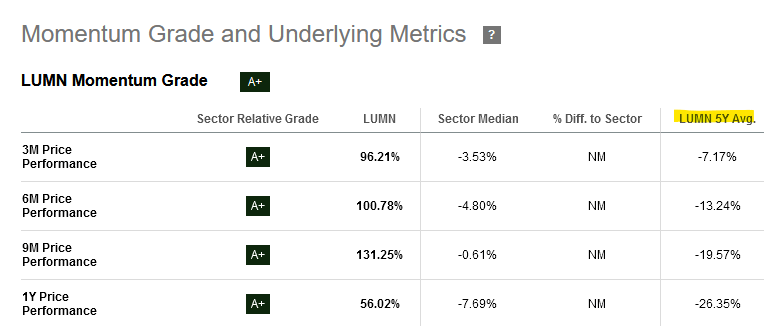 Below, LUMN stock has the strongest score on momentum.