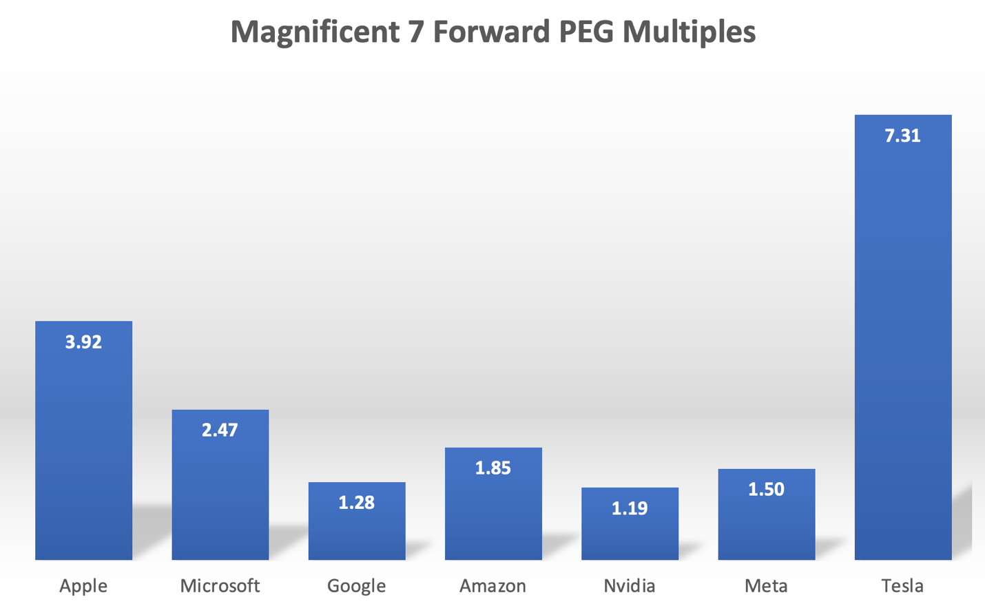 Now using these expected EPS growth rates to determine the Forward PEG ratios reveals that Apple is one of the most expensive Mag 7 stocks, behind only Tesla (TSLA).
