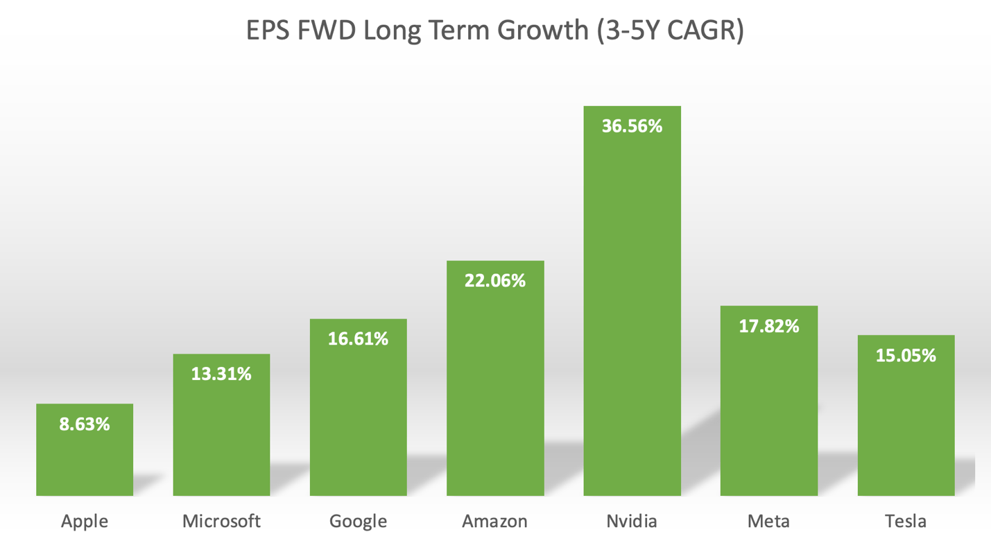 Earlier in the article, we mentioned how the EPS FWD Long-Term Growth (3-5Y CAGR) for Apple has been lowered from 10.39% to 8.63% amid diminishing expectations for an iPhone super-cycle. In fact, out of all the Magnificent 7 stocks, AAPL has the lowest projected EPS growth rate.