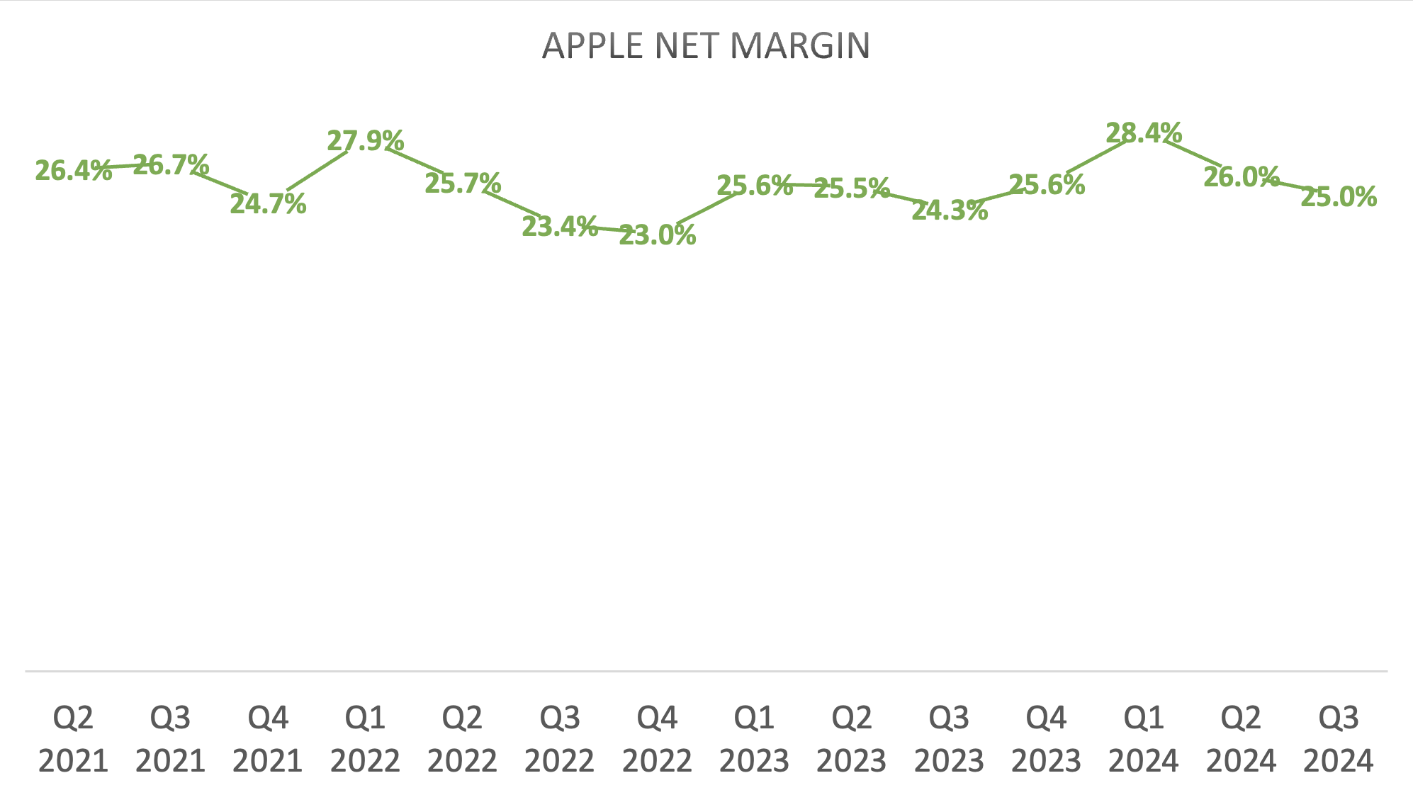 Apple has been able to sustain a net margin of mid-to-high 20s-percentages over the last several years, although rising AI costs coupled with static product prices could indeed result in profit margin compression going forward.
