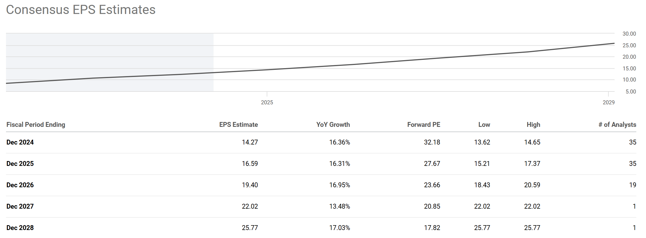 First, I anticipate strong EPS growth ahead to shrink its P/E quickly. The chart below shows the consensus EPS estimates for MA stock in the next five fiscal years. Based on the chart, analysts expect Mastercard’s EPS to grow consistently at double-digit rates over the next five years. For instance, the consensus EPS estimate for fiscal year 2024 is $14.27, translating into an annual growth rate of 16.3% year-over-year. This is then predicted to grow by more than 16% in the next two years to $19.4 in fiscal year 2026. Under the EPS projections, MA’s forward P/E ratio is expected to decline rapidly. The current forward P/E ratio of 32.18x would decline to about 27x by fiscal year 2025 (i.e., cheaper than the S&P 500) and to only about 17.8x in five years.