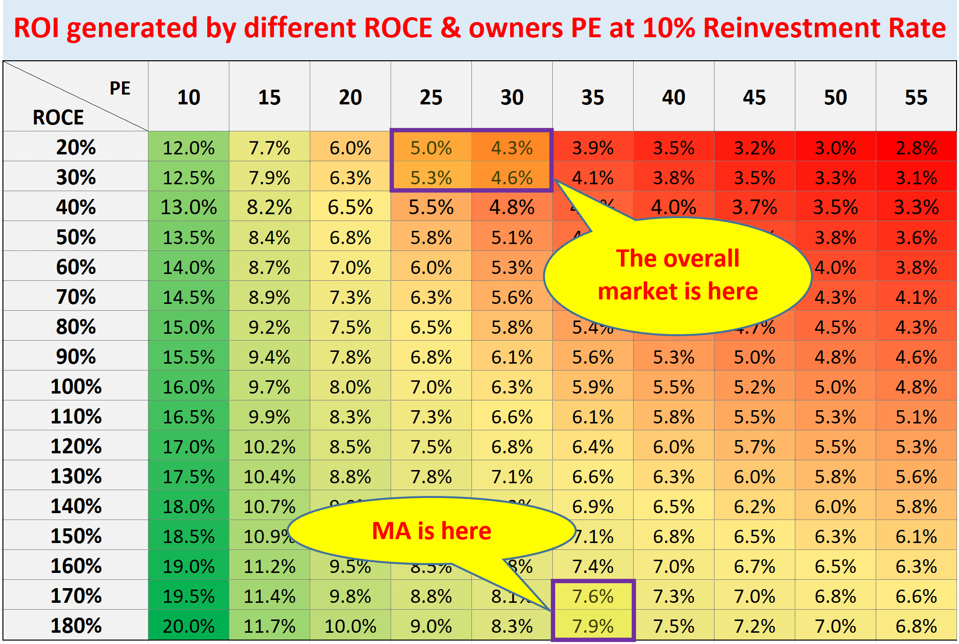 - The long-term ROI (return on investment) for a business owner is simply determined by two things: A) the price paid to buy the business and B) the quality of the business. More specifically, part A is determined by the owner’s earning yield (“OEY”) when we purchased the business. And that is why P/E is the first dimension in our roadmap. Part B is determined by the quality of the business and that is why ROCE, the most important metric for profitability, is the second dimension in our roadmap.