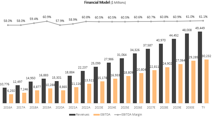 I project Mastercard’s EBITDA margins to increase incrementally up to 61.1%, which is slightly above the company’s all-time highs which occurred pre-pandemic. This projection results in EBITDA growth slightly above revenue growth, which is based on my assumption Mastercard will benefit from operational leverage.