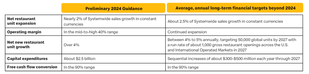 McDonald’s revenue growth is only in the low-to-mid single digits, but the company has another lever to grow: it can leverage its franchise footprint. McDonald’s has more than 40,000 restaurant locations and will continue to add aggressive to the existing real estate footprint in the coming years. The fast-food chain has guided for 4% annual net new restaurant unit growth in FY 2024 which McDonald’s seeks to grow to 5% by FY 2027. By this time, McDonald’s expects to have 50,000 global restaurant units, which would be a roughly 25% increase of its global restaurant footprint.