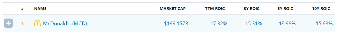 For return on invested capital, I look for an average of 16% or more. MCD’s three-year ROIC is 15.31%, its five-year ROIC is 13.98%, it’s 10-year ROIC is 15.68%. So, even though McDonald’s past average ROIC is under the 16% mark, when we remove the anomaly of COVID years, and look at its increasing ROIC trend and its past 12 months ROIC of 17.32%, it’s on track to be above the 16% desired mark.