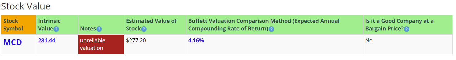 The estimated value of the stock is $277.2, vs. the current stock price of about $277. This indicates that McDonald’s is currently selling at a fair price.