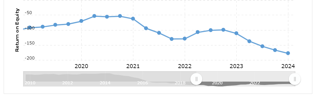 - ROE (5-year average 16% or greater)? No (-105.59%)