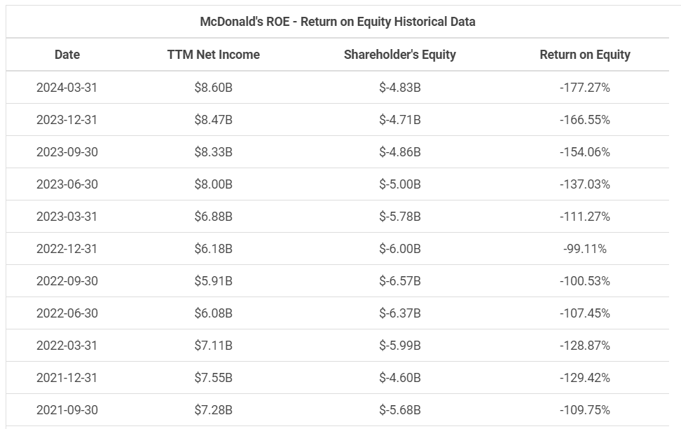 The return on equity has remained negative over the last five years. A negative return on equity – ROE – may raise alarm bells for investors, but a closer look at the financials reveals explanations. McDonald’s focus on aggressive store growth and expansion has necessitated substantial long-term debt and capital leases. Due to these circumstances, a shareholders’ deficit is created, reflecting negative equity. Additionally, the company’s stock buybacks and dividends have further impacted ROE, as McDonald’s has used debt to repurchase shares, effectively reducing equity. Until recently, this negative ROE was not due to declining net income, but rather the result of financial strategies and balance sheet dynamics. However, recent quarters have seen a decline in both top and bottom lines, further affecting ROE. This complex financial scenario highlights the impact of McDonald’s growth strategies and capital allocation decisions on its overall financial metrics. For return on equity, I look for a five-year average of 16% or more. So, McDonald’s does not meet this requirement. The other drawback is that the ROE has been declining over the past three years.