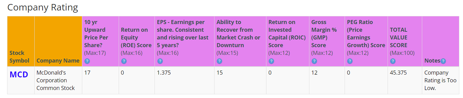 A fast way for me to get an overall understanding of the condition of the business is to use the BTMA Stock Analyzer’s company rating score. McDonald’s shows a rating score of 45.375 out of 100. This is quite low, but also does not account for ROE and ROIC of McDonald’s, making the total score lower than expected. Part of the reason for the low score is because McDonald’s ROE and/or ROIC has been negative in the past five years. This special circumstance will be explained more in the ROE and ROIC sections further below.