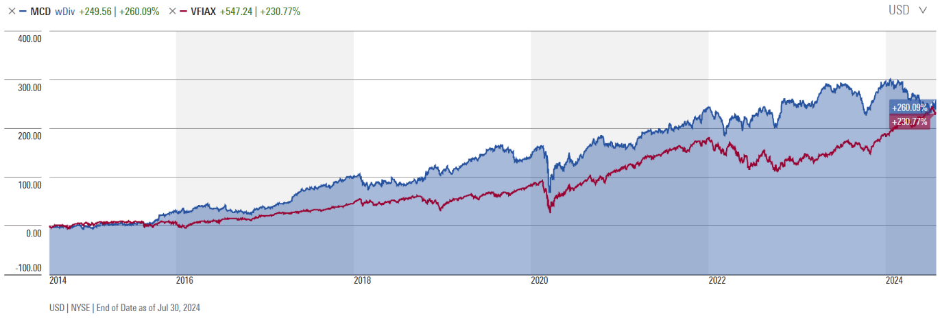 Now, let’s see how McDonald’s compares vs. the US stock market benchmark S&P 500 over the past 10 years. From the chart below, McDonald’s consistently outperforms the S&P 500 over most of the chart’s history.