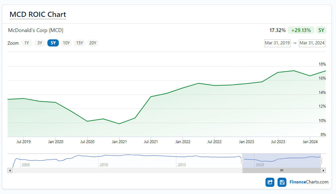 The return on invested capital shows an increasing trend over the last five years. The company has increased capital expenditure year-over-year. McDonald’s invests in digital transformations and remodels of its stores to capture market share and remain innovative. McDonald’s high ROIC is because of its efficient operations, strong brand, and capital investments in store growth and digital initiatives. Optimizing its capital expenditures and leveraging its robust franchise model has been instrumental to maintaining a healthy ROIC. Recent fluctuations in ROIC may be influenced by macroeconomic factors, investment strategies, and capital structure adjustments. But overall, McDonald’s continues to demonstrate a solid ability to generate returns on its invested capital.