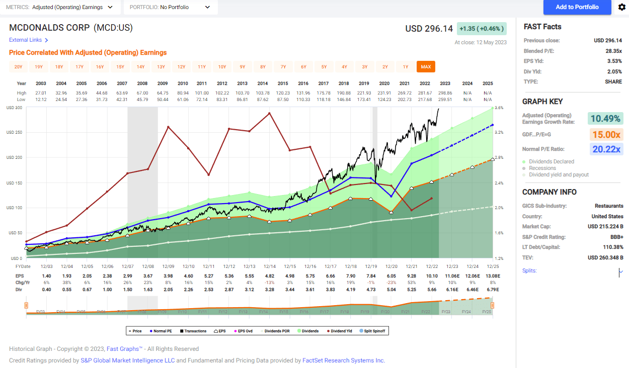 The company’s P/E (price to earnings) ratio stands at 26.9 when using the EPS forecast for 2023. This is a high P/E ratio despite a decent 9% growth rate. In addition, it is close to the highest valuation we have seen over the last eighteen months. Therefore, it seems like the shares of McDonald’s are trading for an unattractive valuation. Following the great Q1 report, the share price skyrocketed, and so did the valuation.