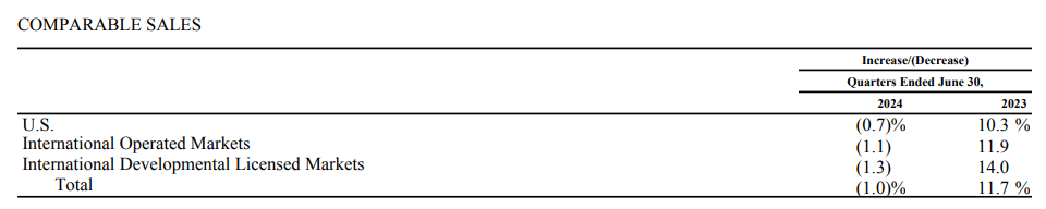 It was the first drop in comparable sales for the fast-food chain since the pandemic hit the U.S. economy in FY 2020. The U.S. market, which is by far the biggest operating market for McDonald’s, reported a 0.7% year over year decline in comparable system-wide sales. International Operated Markets, which includes countries like Australia, Canada, Germany, France and the U.K., saw the second-biggest comparable sales decline in Q2’24 of 1.1%. International Development Licensed Markets, which mostly represent emerging markets, suffered the biggest comparable sales drop of 1.3% year over year. Total comparable sales growth in Q2’24, on a consolidated basis, was 1.0% compared to 1.9% in Q1’24 and 11.7% in Q2’23.