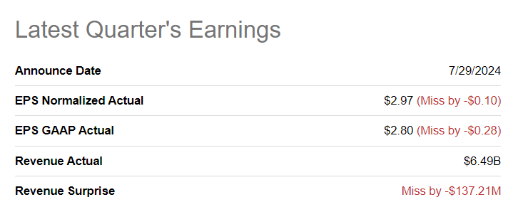 It was an overall weak Q2 earnings scorecard for the fast-food chain on Monday, and it resulted in a double miss on earnings and revenues. Adjusted earnings came in at $2.97 per-share, missing the estimate by $0.10 per-share. The top line reached $6.49B, falling short of the consensus estimate by $137.2M.