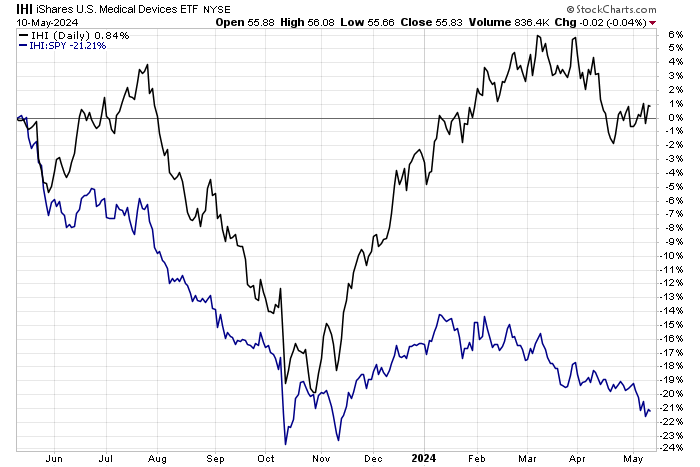 Shares of medical device stocks continue to sag compared to the broader market. The iShares U.S. Medical Devices ETF (IHI) is up just 1% (total return) over the past 12 months compared to a better than 20% performance by the S&P 500. Healthcare sector stalwarts Eli Lilly (LLY) at home and Novo Nordisk (NVO) abroad have powered higher on the back of GLP-1 weight-loss drugs. Still, the bar is somewhat low for out-of-favor industries, such as the medical device niche.