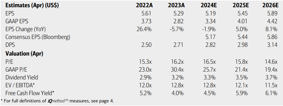 On valuation, analysts at BofA see earnings having fallen about 2% this year, but per-share profits are expected to accelerate in the years ahead. FY 2025 operating EPS should rise closer to $5.50 while FY 26 EPS could approach $6. The current Seeking Alpha consensus forecast numbers are about in line with what BofA forecasts. Revenue growth is seen accelerating from 3.2% in the current year to 5% by 2026.