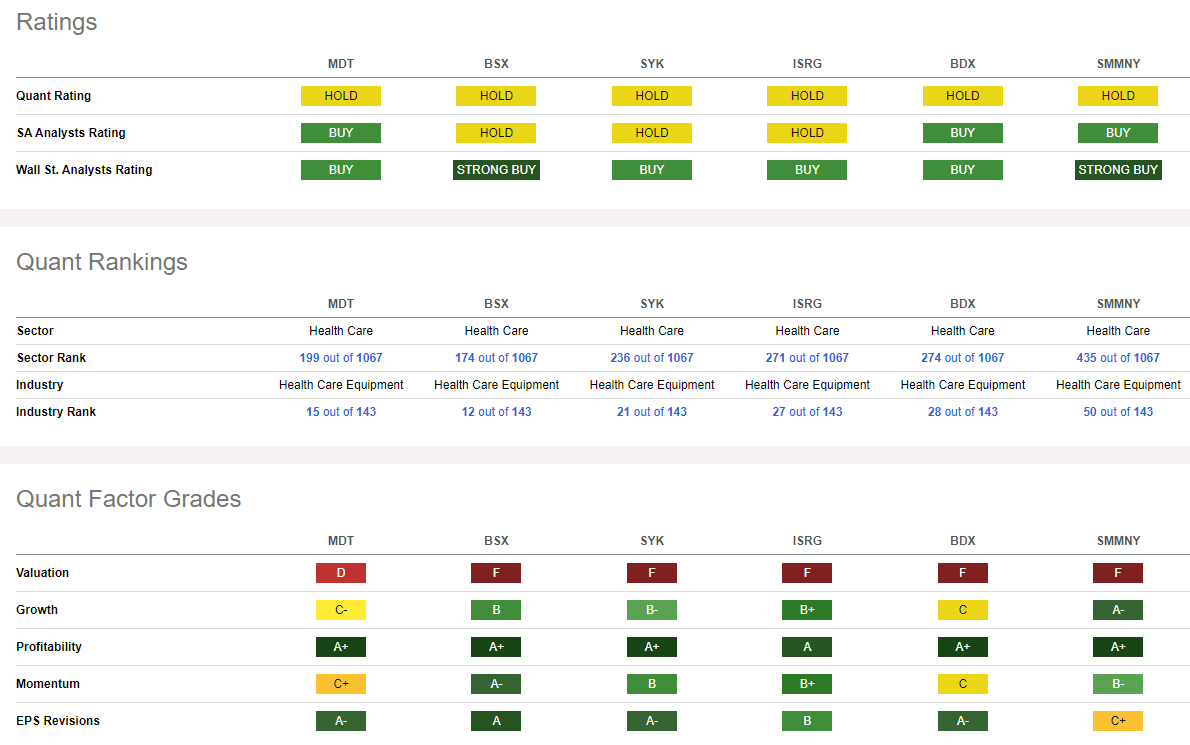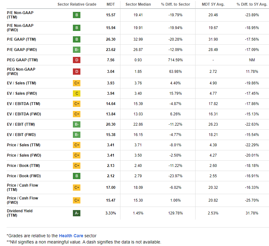 Compared to its peers, MDT features a middle-of-the-road valuation rating, but earnings multiples are attractive on an absolute basis. And while the company’s growth trajectory has been lackluster lately, a growing top line appears likely to translate into solid EPS growth going forward.