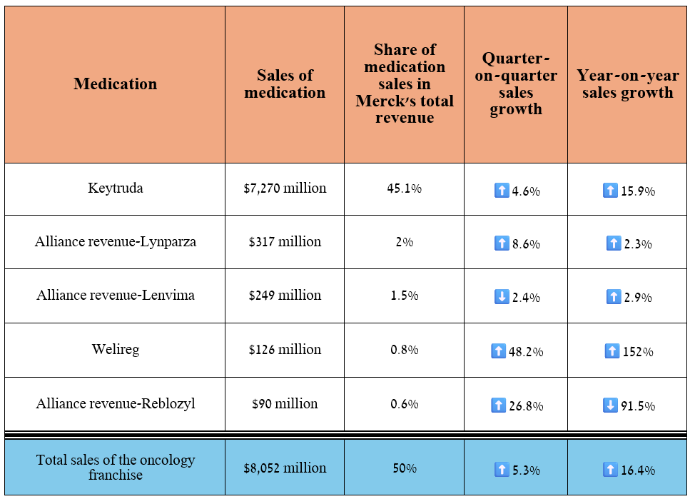- On the other hand, sales of Merck’s oncology franchise totaled about $8.05 billion, up 16.4%, thanks to solid sales of Keytruda, its key blockbuster.