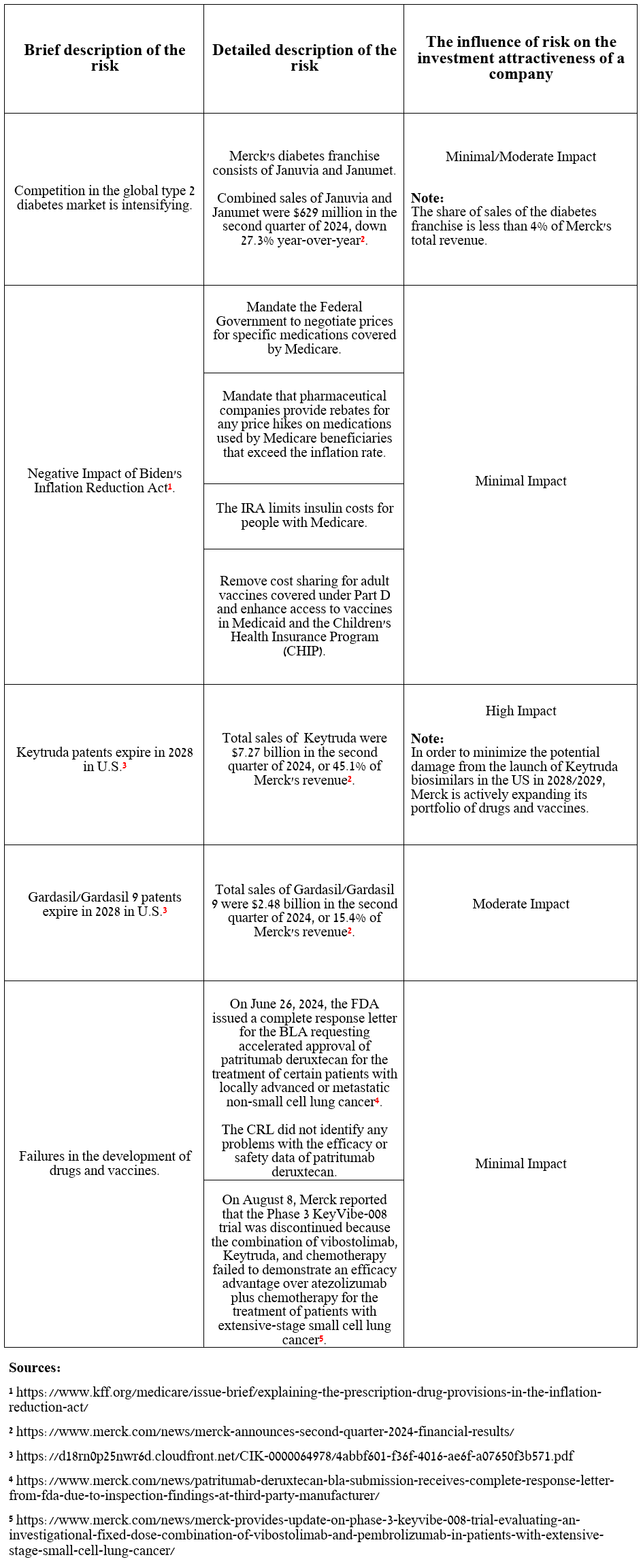 In the table below, I have highlighted several risks that could negatively impact Merck’s investment attractiveness in the long term and those that continue to put downward pressure on its stock price at the moment.