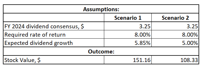 It is challenging to project reliable future long-term earnings and revenue growth for pharmaceutical companies due to the high level of uncertainty about the new patents and potential moonshots. Therefore, I want to proceed with my valuation analysis with the discounted dividend model [DDM]. I use the 8% WACC as the required rate of return, which is close to the projection from valueinvesting.io. I have dividend consensus estimates expecting FY 2024 dividend at $3.25. The dividend growth is also difficult to forecast, but the 10-year CAGR of 5.85% is reliable enough to incorporate into my DDM formula. To demonstrate the susceptibility of the DDM model, I simulate two scenarios. The second scenario has a much more conservative dividend growth rate of 5%.