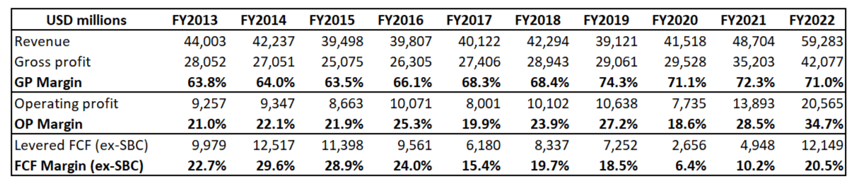The company demonstrated steady revenue growth over the past decade with a 3% CAGR. MRK significantly improved its profitability metrics over the decade, while the free cash flow [FCF] margin deteriorated from about 30% in FY 2014-2015 closer to 20%.