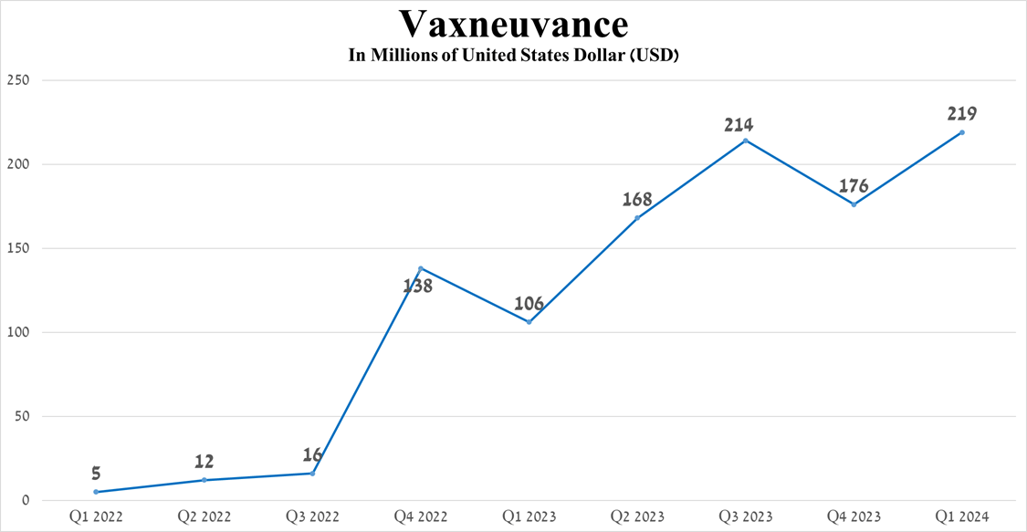 Total sales of Vaxneuvance were $219 in the first quarter of 2024, an increase of 106.6% year-over-year, driven by its ongoing launch for pediatric use in the United States, geographic expansion of its use, and competitive advantage over Pfizer’s Prevnar 13 (PFE).