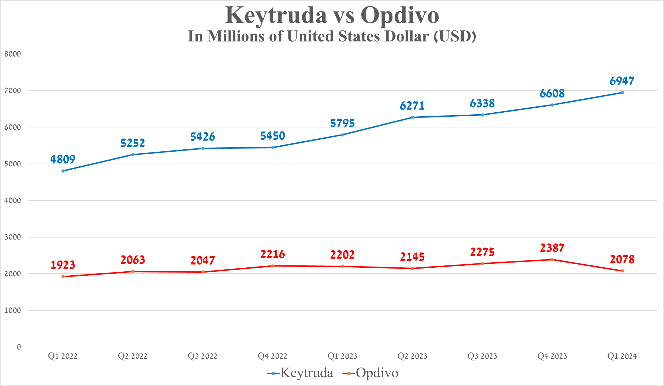 - Keytruda sales were about $6.95 billion in the first quarter of 2024, up 19.9% year-over-year.