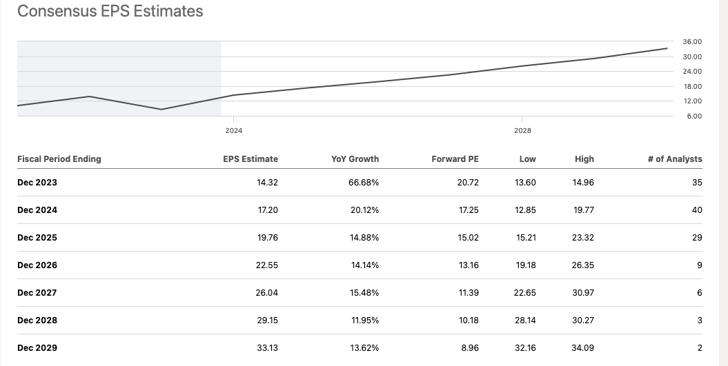 META trades at just 17.2x 2024 consensus earnings estimates and 15x consensus 2025 earnings estimates. Comparably, the S&P 500 trades at ~17x 2024 consensus earnings. While META trades at a similar P/E ratio to the S&P 500, I believe META has a much stronger business due to its competitive advantages. Additionally, I believe META has significant growth drivers which will allow it to grow earnings much more rapidly than the S&P 500. As shown below analysts currently expect META to grow earnings by mid-double digits through 2028. Comparably, I expect the S&P 500 will grow earnings by mid-single digits over the long-term.