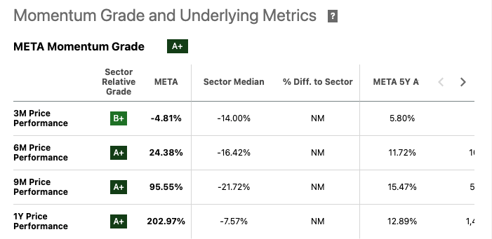 META receives an A+ momentum rating from Seeking Alpha quant grades and I tend to agree. META has significantly outperformed both the S&P 500 and Invesco QQQ Trust ETF (QQQ) on a year-to-date basis.