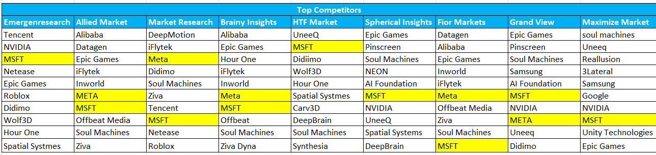 The same nine research companies I used to estimate the market size also presented a list of the key competitors in this field. I have highlighted Microsoft and Meta in yellow.