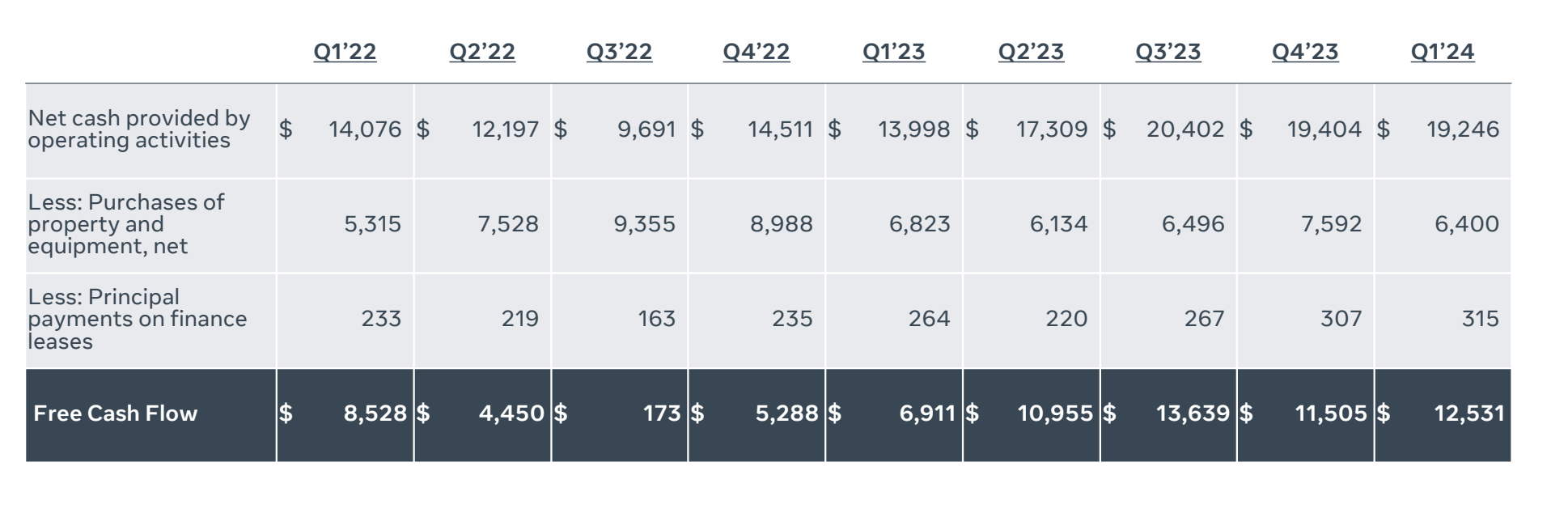 • Despite losses from its Reality Labs business, Meta’s cash flow remains strong, with an annualized FCF of over $50 billion.