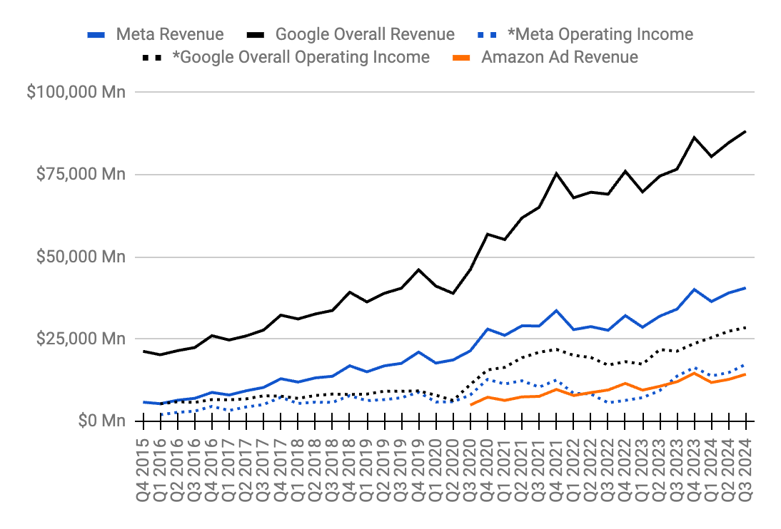 Google (GOOG) (GOOGL), Meta and Amazon (AMZN) are digital ad leaders, and they continue to increase ad operating income and revenue. Note that some of Google’s revenue below comes from sources other than advertising, whereas we only show the ad segment for Amazon. For example, nearly 13% of Google’s overall 3Q24 revenue was from Google Cloud below: