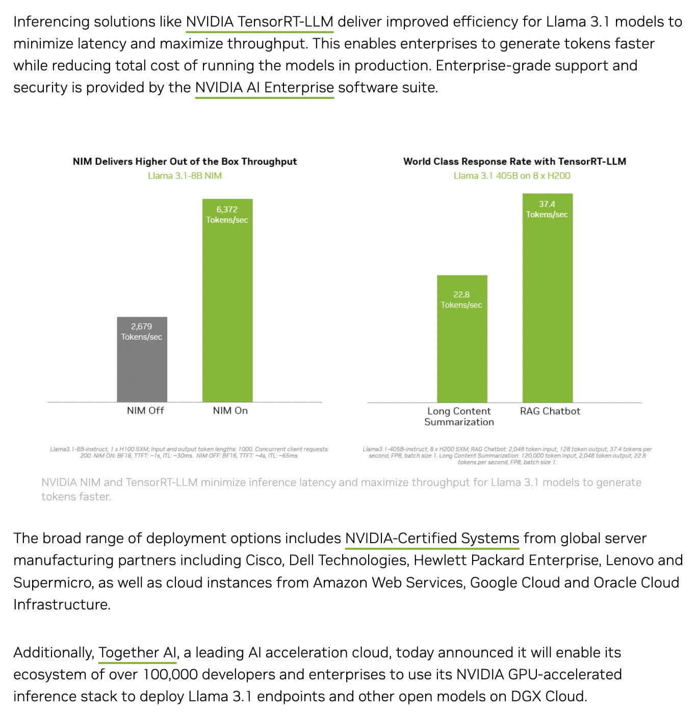 Nvidia shows that it can increase performance of models like Llama 3.1 with optimized NIMs. Inferencing solutions like NVIDIA TensorRT-LLM improve efficiency for Llama 3.1 models to minimize latency and maximize throughput, enabling enterprises to generate tokens faster while reducing total cost of running the models in production.