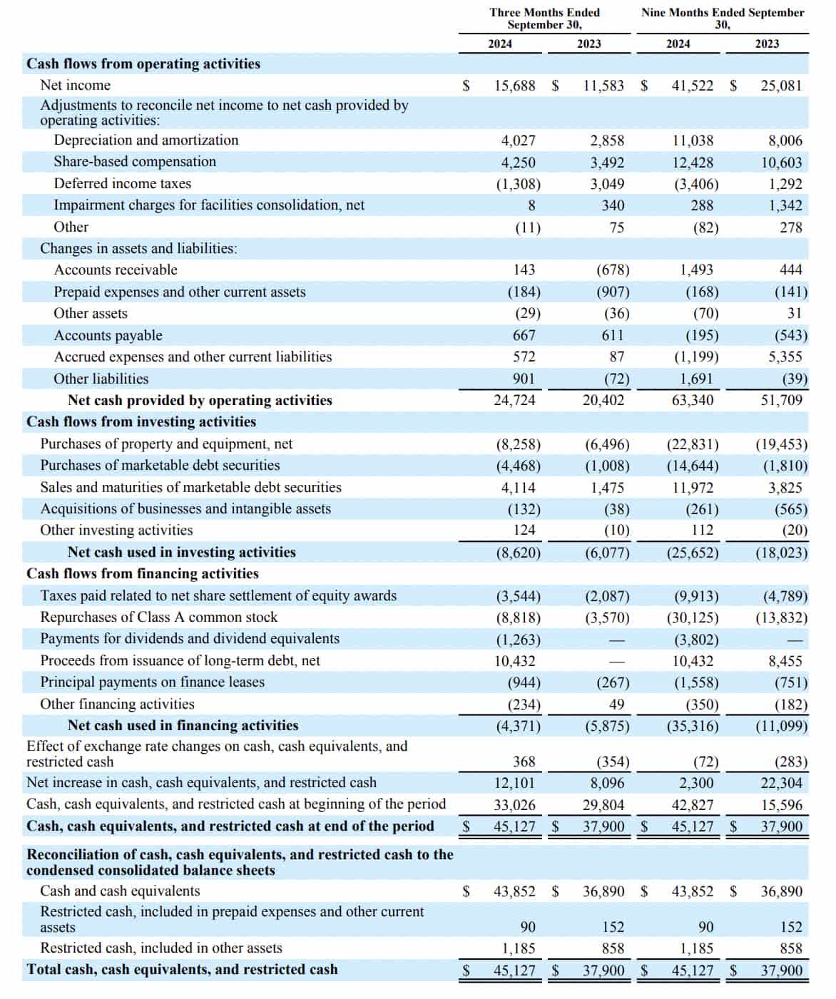 Per the 3Q24 10-Q, 2,180,000,871 A shares + 344,487,662 B shares gives us a total of 2,524,488,533 as of October 25, 2024. Multiplying by the November 12 share price of $584.82 gives us a market cap of $1,476 billion. The market cap is inside my valuation range so I mainly think the stock is a hold, but I’ve been doing some trimming.