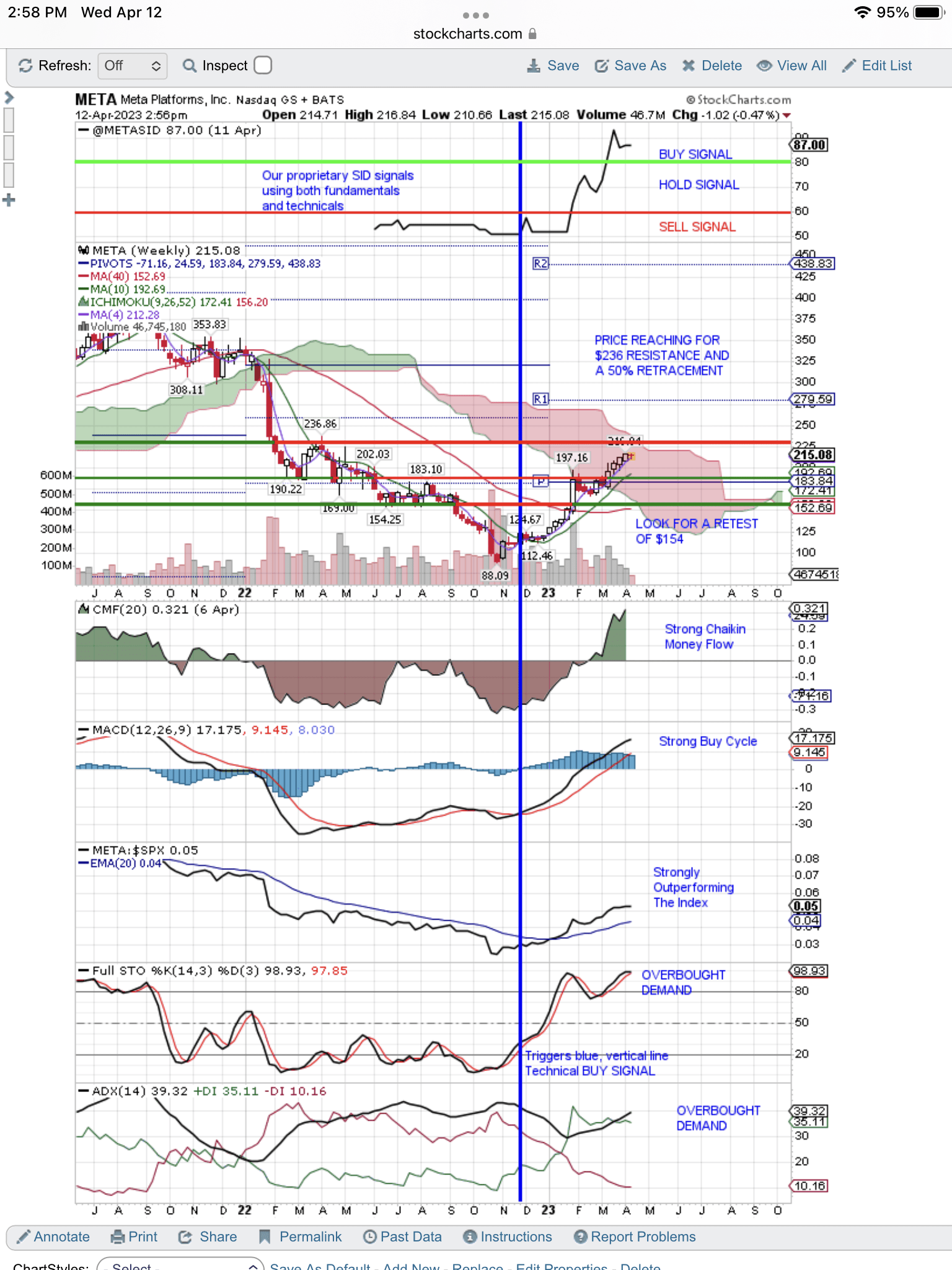 As you can see on the above chart, all the signals are still positive. Chaikin Money Flow is improving. The Moving Average Convergence/Divergence (MACD) signal has a crossover Buy Signal. The Full Stochastic (Full STO) has triggered our vertical, blue line Buy Signal. The uptrend in META:SPX indicates that META is outperforming the market. So what’s the problem?