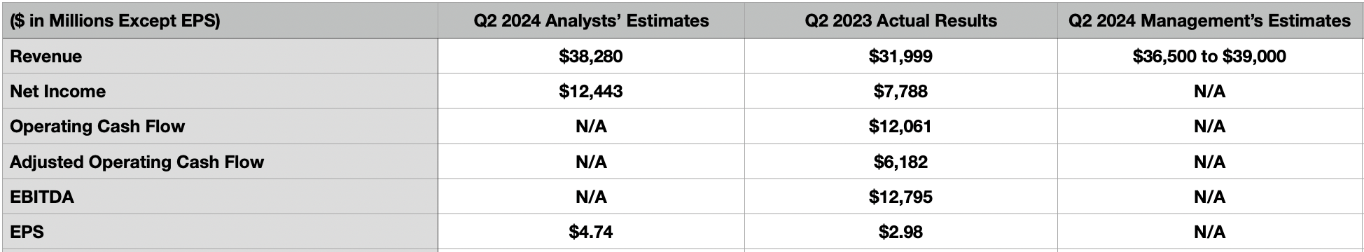 • Analysts anticipate revenue growth of 19.6% and earnings per share of $4.74 for Meta Platforms for the second quarter of 2024.