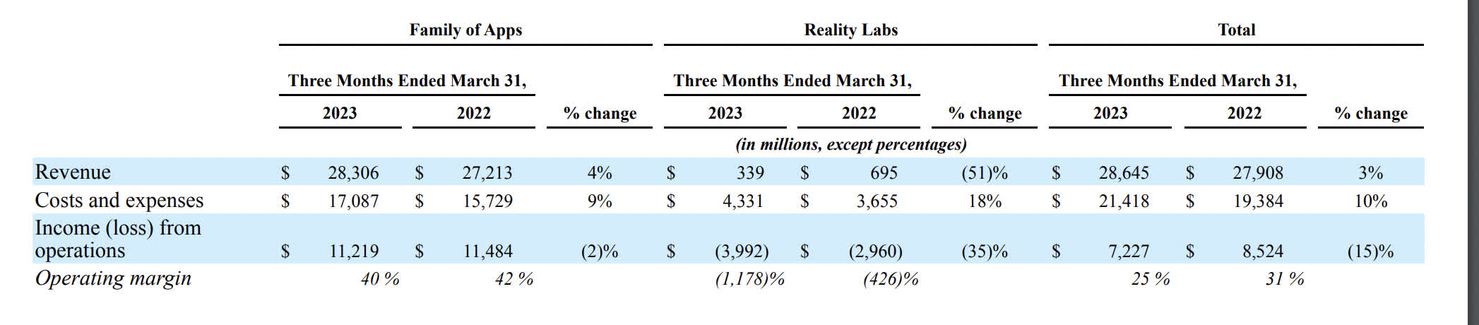 Revenue and income growth quarter over quarter, 2022-2023 are also on a nice upswing. FOA still dominates the top and bottom line and Facebook remains the workhorse. Reality Labs continues to be a money sink with less revenue and higher costs.