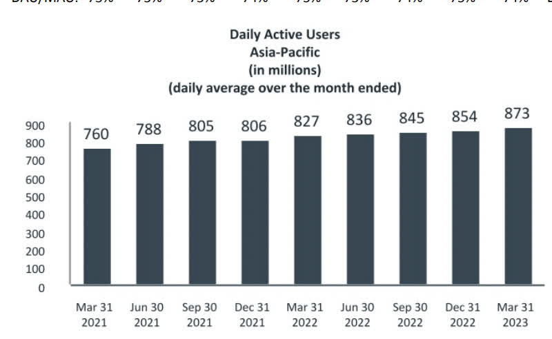 Asia Pacific growth trends in active daily users are one of the most positive stories in the growth trajectory of the FOA. Covid shut off a lot of friends and family communication from Asia/China to the West. Although WeChat dominates China and the areas immediately surrounding it, VPNs are still good enough to get around app blockages and continue to add new users. Hong Kong and Taiwan are also great areas for user growth.